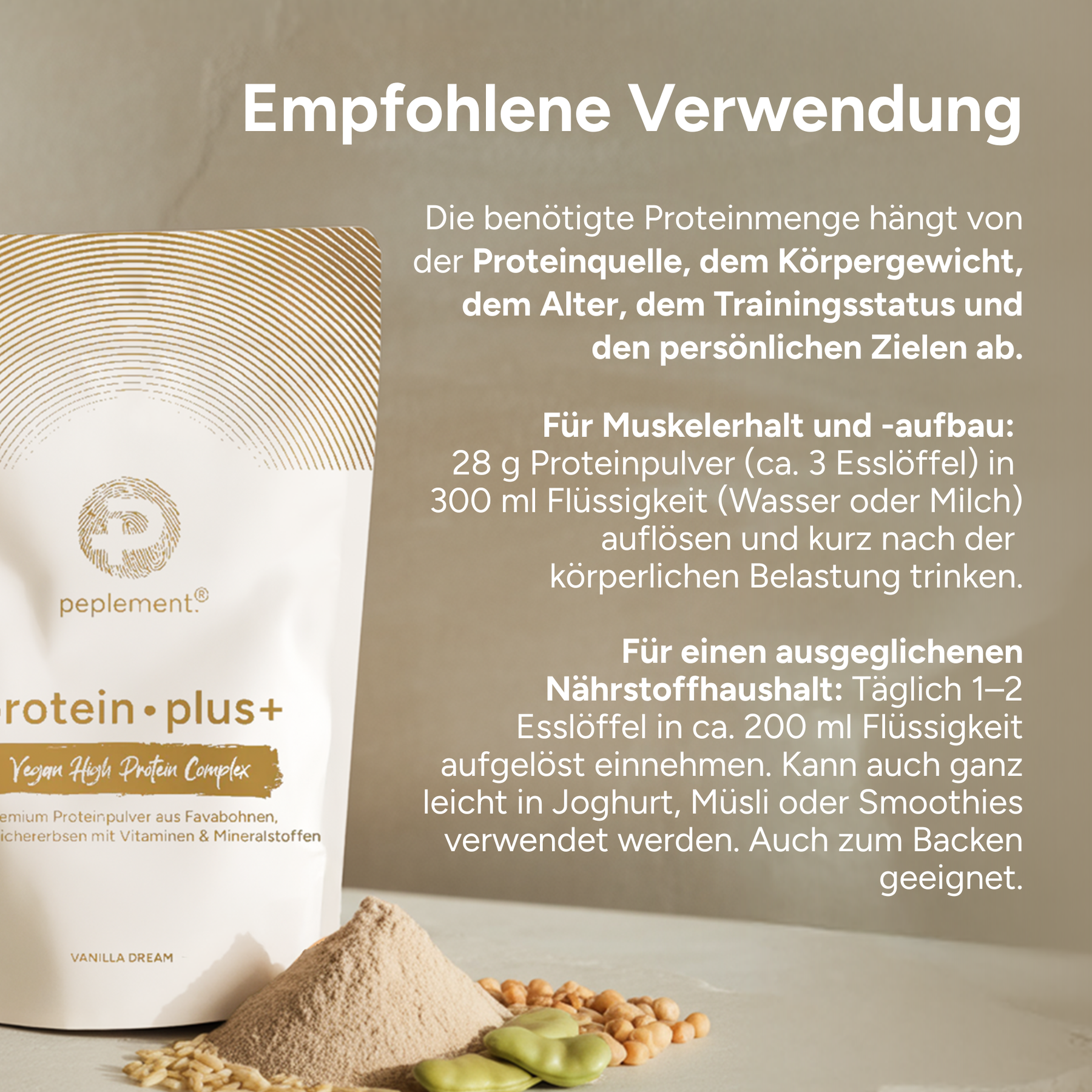 Für den Muskelerhalt und Aufbau ca. 35 g Pulver (ungefähr 4 Messlöffel) in ca. 200 ml Flüssigkeit lösen und zeitnah zur körperlichen Aktivität trinken.